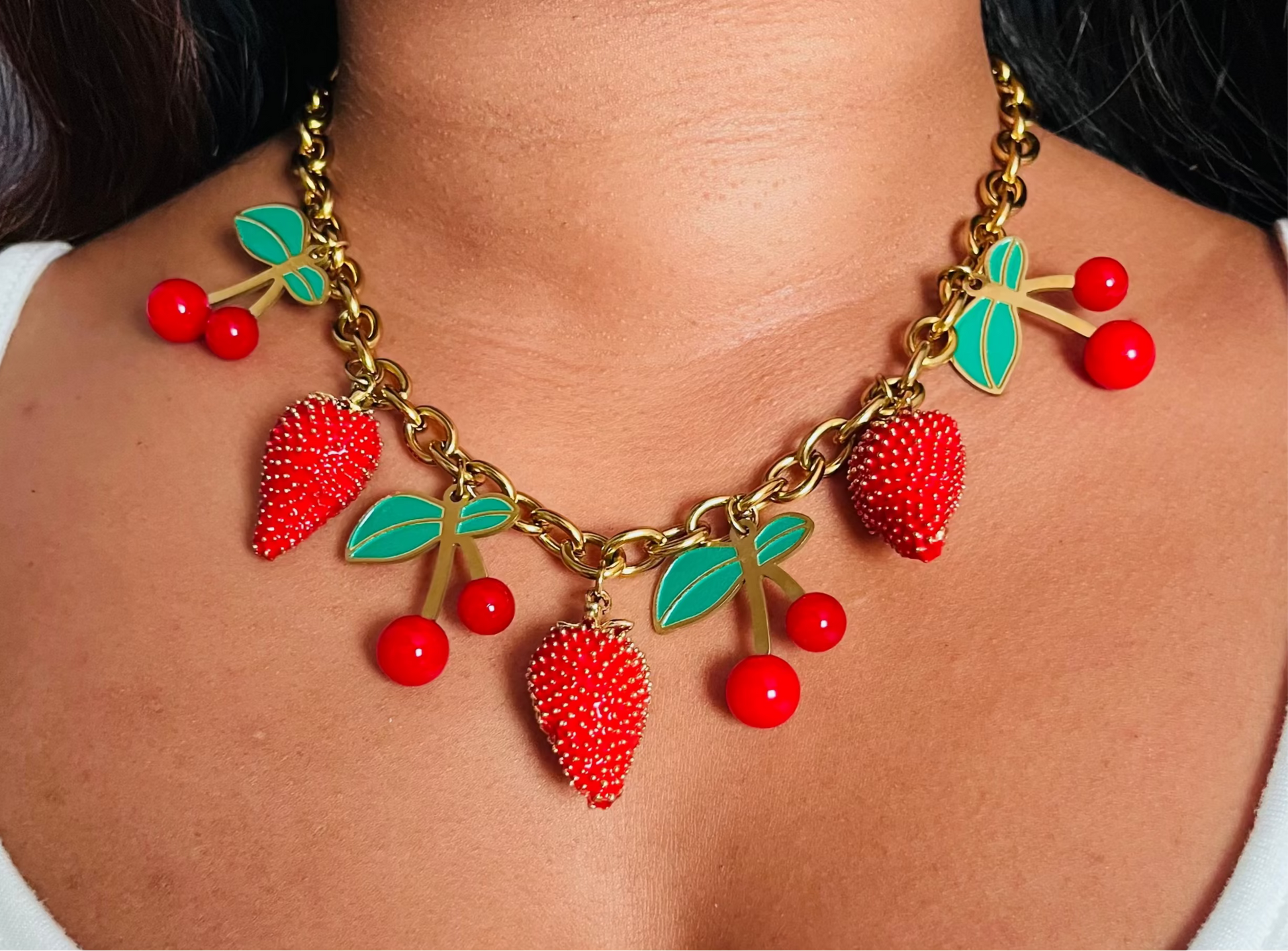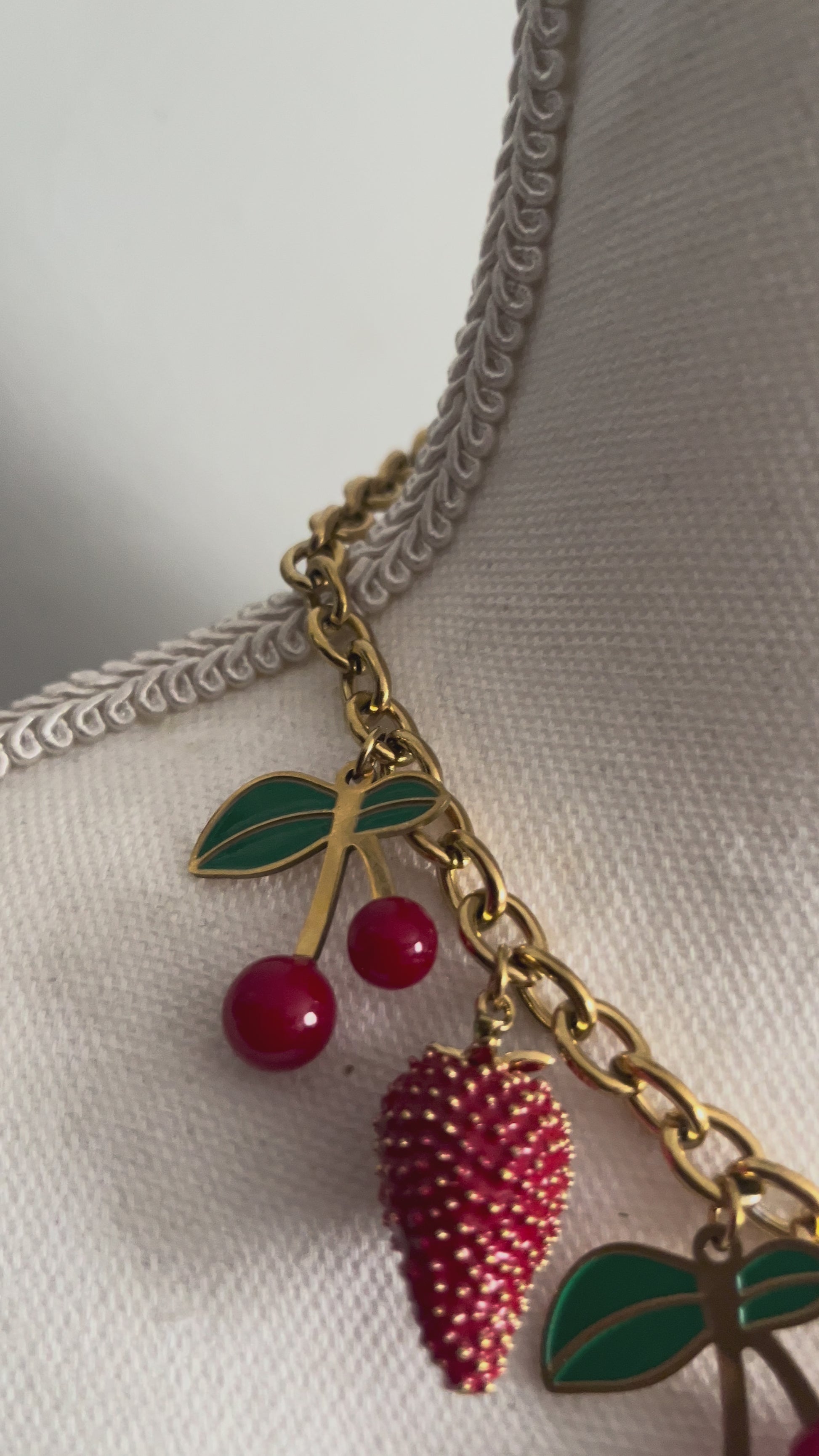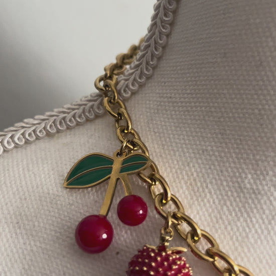 Frais, audacieux et délicieusement gourmand, ce collier incarne l’esprit de la déesse Antheia, muse des fleurs, des jardins en fête et des saisons florissantes. À travers ses charms en forme de fraises juteuses et de cerises éclatantes, il célèbre un été éternel celui qui ne se fane jamais.