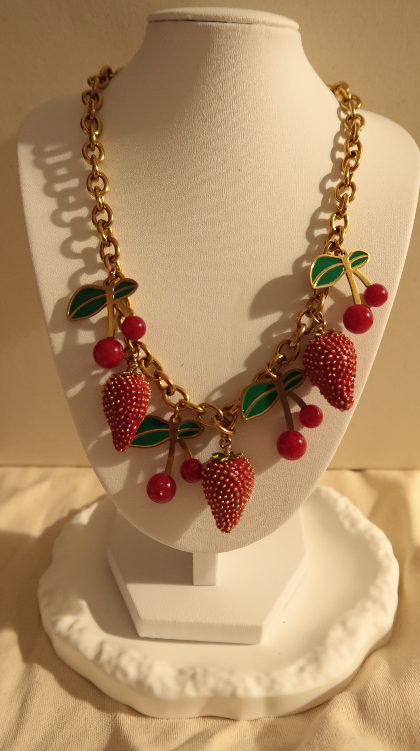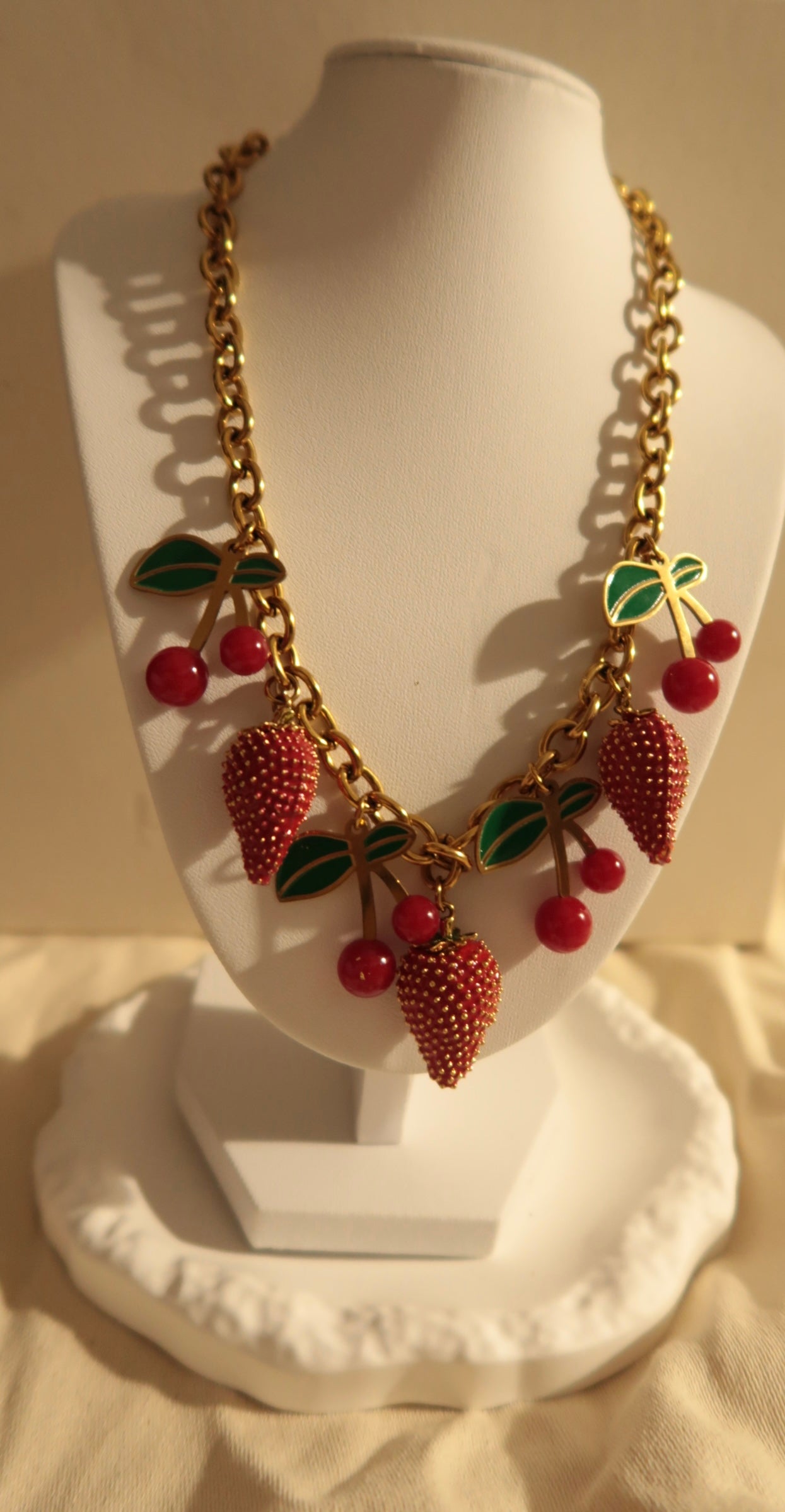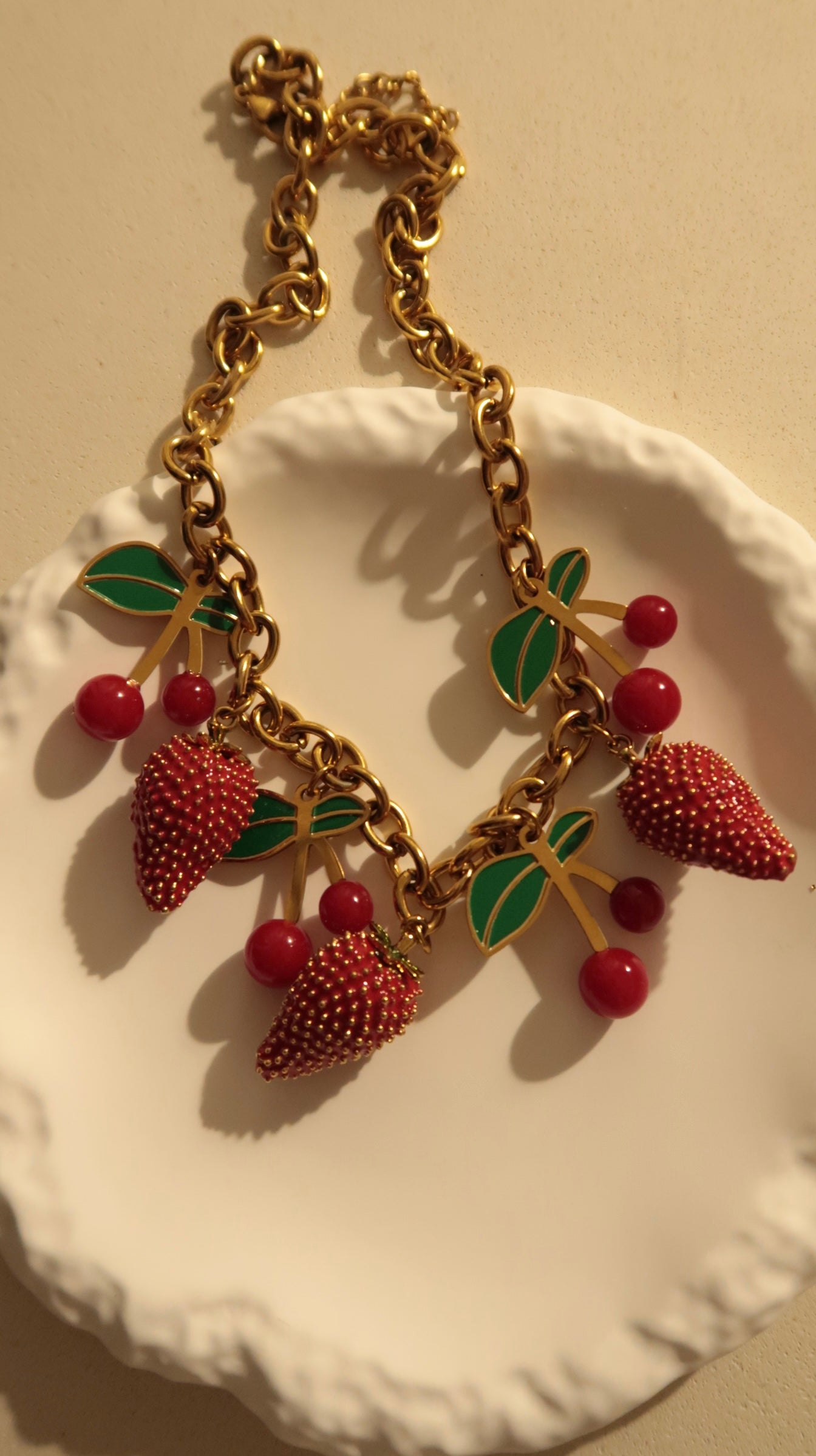 Frais, audacieux et délicieusement gourmand, ce collier incarne l’esprit de la déesse Antheia, muse des fleurs, des jardins en fête et des saisons florissantes. À travers ses charms en forme de fraises juteuses et de cerises éclatantes, il célèbre un été éternel celui qui ne se fane jamais.